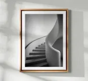 Visualizzazione in bianco e nero di un'architettura d'interni minimalista: scala a chiocciola con ampi gradini, ringhiera liscia in stucco e corrimano in metallo, immersa in una luce morbida che accarezza le curve. Una composizione fluida, elegante e rilassante, ideale per ampliare visivamente lo spazio e portare calma e modernità. Perfetta per un soggiorno, una camera da letto, un corridoio o un ufficio, in stile contemporaneo, scandinavo, japandi o wabi-sabi.