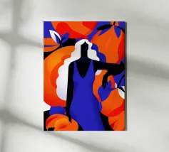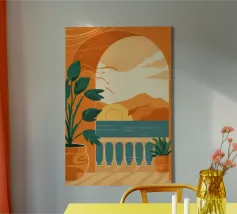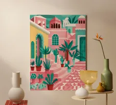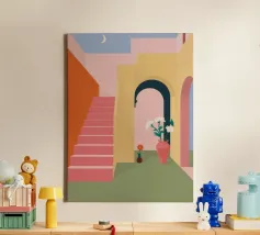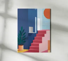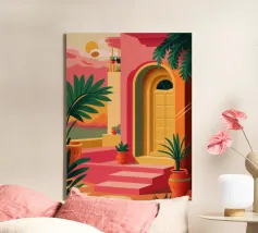 Scale rosse e vivaci conducono attraverso un edificio colorato e semplificato verso un lussureggiante ingresso ad arco, suggerendo un viaggio verso una destinazione bella ed esotica.