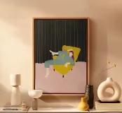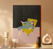 Questo disegno mostra una donna dai capelli viola che si sdraia con disinvoltura su una poltrona giallo senape: rilassata, sicura di sé, completamente immersa nel momento. Il contrasto tra lo sfondo scuro, il pavimento rosa e la poltrona di velluto giallo crea un linguaggio visivo potente e moderno dal fascino retrò.