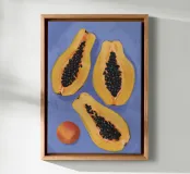 Una natura morta semplice ed elegante di una papaya tagliata a metà su un piatto blu intenso. La composizione minimalista e il sorprendente contrasto cromatico tra il frutto arancione e il piatto blu creano un pezzo moderno e sofisticato.