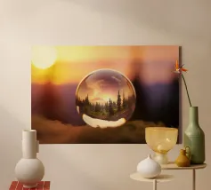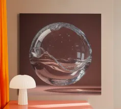 Una sfera trasparente poggia tranquillamente su una superficie bianca e pulita, catturando la luce intorno a sé. La sua forma liscia e cristallina riflette le luci soffuse e rivela le ombre sottili sottostanti, creando un senso di purezza e semplicità. La sfera sembra quasi priva di peso, come una goccia di luce congelata in uno spazio perfettamente calmo.