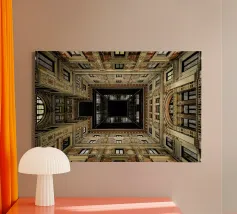 Un drammatico interno circolare in bianco e nero con colonne imponenti, finestre ad arco e intricati motivi geometrici visti da una prospettiva fisheye, che evidenzia la simmetria e la grandezza architettonica.