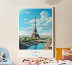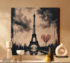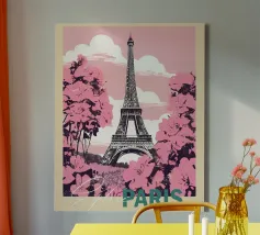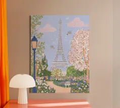 Questa rappresentazione iperrealistica della Torre Eiffel mostra la sua imponenza incorniciata da delicati fiori di ciliegio rosa in piena fioritura. L'immagine, ambientata in un cielo blu intenso punteggiato da soffici nuvole bianche, cattura il contrasto armonioso tra l'intricata struttura in ferro della torre e gli eterei petali. I fiori incorniciano la scena, attirando lo sguardo verso l'alto in direzione dell'iconica guglia, creando un'atmosfera romantica e sognante. Questa composizione serena incarna l'essenza del fascino parigino e del rinnovamento primaverile.