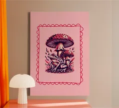 A vivid and whimsical scene featuring a bright pink frog sitting atop a red toadstool with white spots, surrounded by lush foliage and glowing flowers in a misty, enchanted forest. The magical ambiance enhances the surreal beauty.