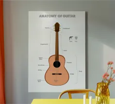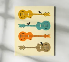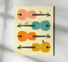 Esplora la bellezza degli strumenti a corda con questa dettagliata tabella didattica che presenta violino, violoncello, viola, chitarra, arpa e ukulele.