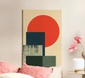 Un sole rosso radioso sorge su blocchi geometrici stratificati, evocando l'armonia di forma e funzione. "Sun Over Blocks" è una meditazione ispirata al Bauhaus sul contrasto, la semplicità e l'equilibrio.