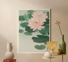 A woodcut with lotus leaves and water lilies on the shore, with a setting sun in a pale pink sky over a calm lake. An island can be seen on the horizon in the background, surrounded by trees and distant mountains. This artwork embodies the aesthetics of the Edo period and shows the simplicity of the woodcut techniques and the calm colours.