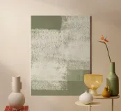 Pittura acrilica minimalista con pennellate di colore bianco su sfondo verde salvia e verde oliva.