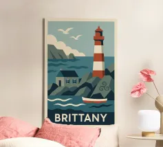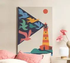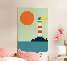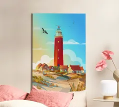 Questa opera d'arte modernista presenta il faro di Hörnum come una struttura audace e dinamica, che enfatizza gli angoli acuti e le forme astratte. In equilibrio tra realismo e astrazione, il faro è semplificato in suggestive bande rosse e bianche, sullo sfondo di un cielo blu intenso e di una sabbia strutturata. Il gioco di campi di colore e ombre della composizione crea un senso di profondità, rendendolo un tributo contemporaneo al patrimonio marittimo e alla bellezza costiera di Sylt.