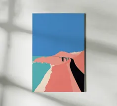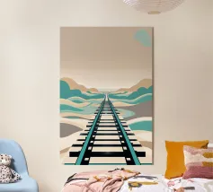 Questa rappresentazione artistica cattura l'iconica linea ferroviaria di Sylt con un approccio minimalista e astratto. La ferrovia si estende all'infinito verso l'orizzonte, fondendosi perfettamente con le morbide dune e le sfumature oceaniche. L'opera enfatizza la transizione senza soluzione di continuità tra le strutture costruite dall'uomo e il paesaggio costiero circostante. I toni tenui del beige, del verde acqua e del marrone sabbioso conferiscono all'immagine una qualità onirica, riecheggiando l'essenza tranquilla e potente del Mare del Nord. La composizione attira lo sguardo lungo i binari, evocando un senso di nostalgia, solitudine e la promessa di un viaggio senza fine.