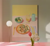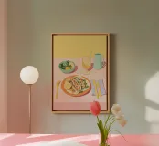 Questa illustrazione straordinariamente vivace è una festa per gli occhi, catturata in un audace design Color Block di rosa caldo e giallo brillante. Il centrotavola presenta due deliziosi tacos su un piatto arancione brillante, accompagnati da un'insalata fresca e da una limonata rinfrescante. La composizione è estremamente grafica e minimalista, con colori forti come il verde menta e le posate color lavanda che aggiungono un contrasto giocoso. Questo pezzo è il massimo esempio di Dopamine Decor e Pop Art minimalista, perfetto per una cucina o una zona pranzo contemporanea e gioiosa. Una colorata celebrazione del martedì dei tacos! Sperimentate l'eccellenza di