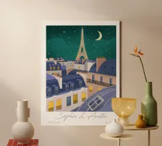 L'immagine mostra la Torre Eiffel in un cielo notturno di un blu intenso, con nuvole bianche, stelle scintillanti e una mezzaluna arancione. La torre stessa risplende nei toni caldi del giallo e dell'arancione e si staglia radiosa sullo sfondo scuro.