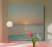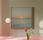 Tramonto sulle calme acque dell'oceano con riflessi pastello tela con Cornice a cassetta