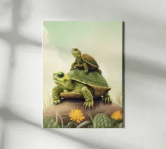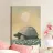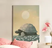 A large turtle, a simple and elegant illustration of the massive creature walking through grass with white flowers under a pastel coloured sky with a sun in the background. The artwork is presented in a vintage aesthetic style with muted colours and soft lighting creating a tranquil atmosphere.