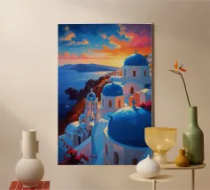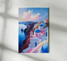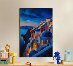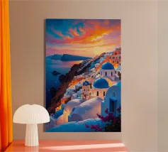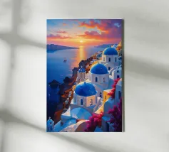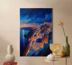 Scoprite il fascino mozzafiato dell'iconica architettura imbiancata di Santorini mentre si crogiola nella calda luce dorata del crepuscolo. Adagiati sul bordo della caldera, i tetti a cupola e gli edifici a cascata si illuminano sullo sfondo del mare Egeo. Il drammatico gioco di luci e ombre esalta la scena, mentre il cielo limpido della sera si trasforma in tonalità più profonde. Questo incantevole panorama cattura il fascino senza tempo e la tranquillità di una delle destinazioni più romantiche del mondo, evocando un senso di meraviglia e di fuga.