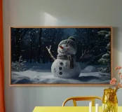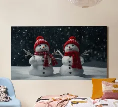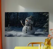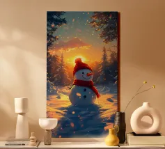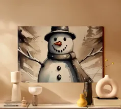 Un allegro pupazzo di neve con cappello e sciarpa a maglia è in piedi tela
