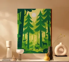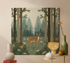 un cervo, uccelli e varie piante in una foresta con alberi ad alto fusto tela