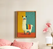 Un lama bianco con orecchie e naso neri poggia su una base strutturata di colore arancione. Indossa una sciarpa a righe colorate in rosso, arancione, giallo e turchese. Gli occhi chiusi, leggermente sorridenti, su uno sfondo giallo-turchese diviso: allegro e affascinante.