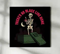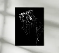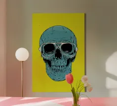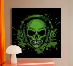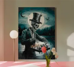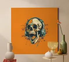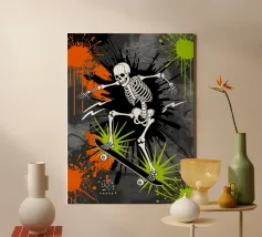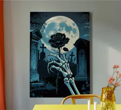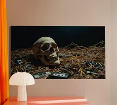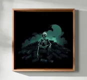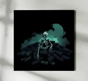 Uno scheletro siede tra vecchie cassette in un'atmosfera spettrale tela
