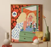 This artwork shows a person with blonde hair looking into a vanity mirror. The background is filled with floral wallpaper, and the vanity table is adorned with various items, creating a nostalgic and intimate scene.