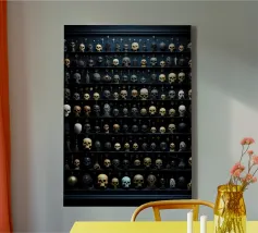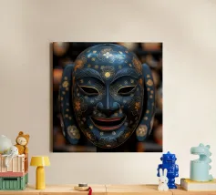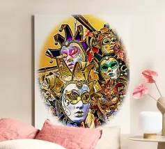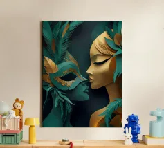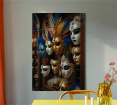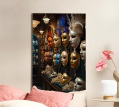 Una splendida collezione di maschere veneziane artigianali esposte in una sontuosa vetrina di legno. Gli intricati dettagli in oro, le ricche piume e i colori vivaci riflettono l'eleganza senza tempo del Carnevale di Venezia. Ogni maschera racconta una storia di mistero, tradizione e artigianato artistico. La calda illuminazione ambientale esalta il fascino del lusso, rendendo quest'opera d'arte perfetta per gli amanti del patrimonio europeo e dell'estetica teatrale. Un must per chi apprezza l'arredamento sofisticato e la bellezza culturale.