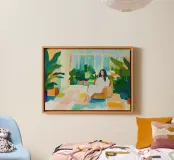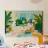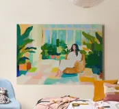 Un dipinto digitale ad alta risoluzione, vibrante ed espressivo, che cattura un momento di sereno relax in un giardino d'inverno o in un jungalow assolato. La scena presenta una donna comodamente seduta su una poltrona color ocra, circondata da un'abbondanza di rigogliose piante da interno in vasi di terracotta. Il pavimento e le pareti sono resi con energiche pennellate di blocchi di colore in morbide tonalità pastello - rosa, menta, giallo e pesca - che conferiscono all'opera un aspetto di mosaico moderno e astratto. Le grandi finestre creano un'estetica luminosa e ariosa. Questa stampa è perfetta per iniettare il Biophilic Design e l'allegria della dopamina.