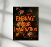 L'immagine presenta una natura morta floreale che ricorda i dipinti classici, sovrapposta al testo "Embrace Your Imagination" (Abbraccia la tua immaginazione) in grassetto arancione. La composizione comprende rose, altri fiori e piante verdi nei toni del rosa, del bianco, del rosso e del blu su uno sfondo scuro. Nella parte superiore dell'immagine sono presenti anche un uccello e una farfalla.