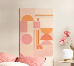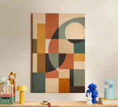 This abstract composition explores harmony through overlapping geometric forms and a warm, vintage-inspired palette. Rounded rectangles intersect softly, creating layered transparencies that suggest movement and depth without rigid structure. Tones of terracotta, coral, ochre, soft cream, and muted gold evoke mid-century modern design while remaining fresh and contemporary. Subtle surface texture adds a tactile quality, balancing precision with warmth. The artwork reflects quiet rhythm and balance, making it a refined statement piece for modern, minimalist, or retro-inspired interiors.
