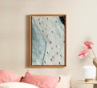 This artwork depicts a dynamic aerial perspective of skiers dispersed across a luminous snowfield, painted with expressive, textured brushstrokes. The contrast between the expansive white surface and vivid accents of red, orange, and green creates a sense of rhythm and movement. Each figure leaves a subtle trace, suggesting both individuality and collective flow. The composition transforms a simple winter scene into an abstract meditation on motion, space, and human presence, evoking calm energy, balance, and the fleeting beauty of winter activity.