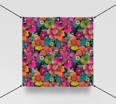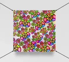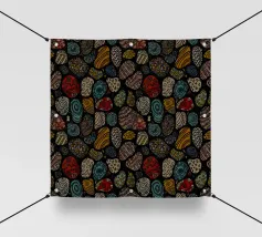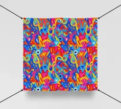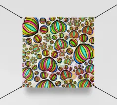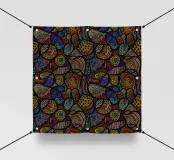 Un audace e vibrante motivo astratto con cerchi colorati, vortici e forme geometriche in ricche tonalità gioiello tra cui verde acqua, arancione, viola, giallo, magenta e marrone su sfondo nero. Questo energico disegno si ispira ai modelli tessili africani e all'arte etnica con la sua disposizione dinamica di motivi decorativi. Perfetto per gli amanti dell'arte culturale, per gli appassionati di motivi audaci e per tutti coloro che apprezzano i disegni vibranti di ispirazione etnica con il massimo impatto cromatico.
