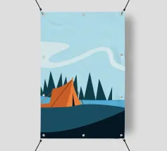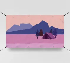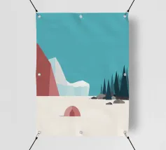Illustrazione paesaggistica minimalista di una regione glaciale in Alaska: foreste di pini scuri, montagne innevate e una piccola tenda in primo piano. Questo poster cattura la natura selvaggia, la tranquillità e lo spirito avventuroso della natura nordamericana.