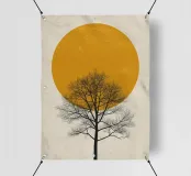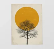 Immergetevi nella serena bellezza di "Golden Horizon Tree", una stampa digitale minimalista che cattura una profonda tranquillità. Questa straordinaria opera presenta una maestosa sfera giallo-dorata, che ricorda un sole o una luna potenti, e che fa da sfondo caldo a una tela bianco sporco, leggermente consumata. In primo piano, l'intricata silhouette di un albero spoglio e tentacolare si erge in netto ed elegante contrasto, con i suoi rami delicati che si protendono verso l'alto. Questo disegno celebra la bellezza grezza della natura attraverso forme semplici e una tavolozza ricca e terrosa.
