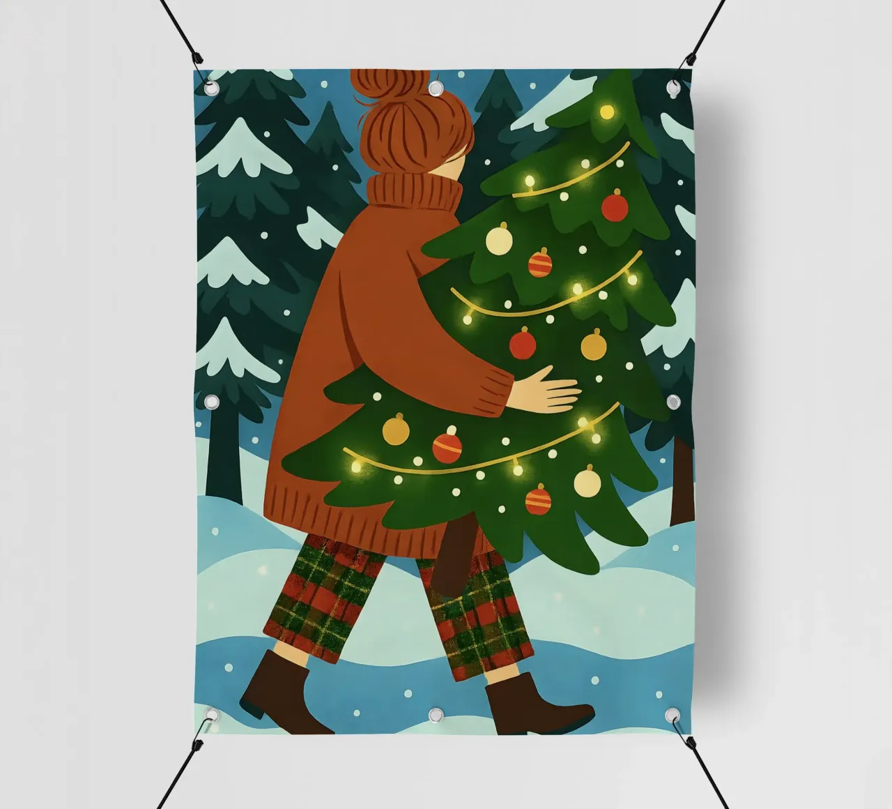 Simpatica arte natalizia stravagante di una donna che trasporta il suo albero di Natale in una foresta innevata. L'albero di Natale è illuminato da luci fatate.