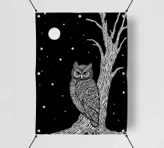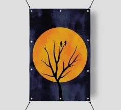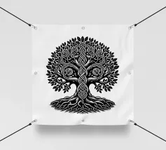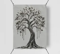 Questa silhouette mostra un albero nodoso e consumato dalle intemperie, con fili di muschio pendenti su cui sono appollaiati diversi corvi. Due lanterne pendono dai rami, mentre i pipistrelli volano sullo sfondo. Il disegno trasmette un'atmosfera misteriosa e un po' cupa che ricorda vecchie leggende o mondi fantastici. Ideale per gli appassionati di stile gotico, estetica fiabesca o decorazioni di Halloween. Il contrasto minimalista tra il nero e lo sfondo chiaro aumenta l'effetto drammatico.