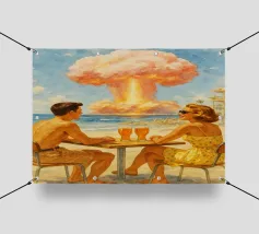 Grazioso soggiorno di metà secolo con divani gialli e un'esplosione sullo sfondo. Collage sulla fine del mondo di MsGonzalez
