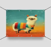 Un lama bianco con orecchie e naso neri indossa una sciarpa a righe colorate in rosso, arancione, giallo e turchese. Con un leggero sorriso e gli occhi chiusi, si trova su un fondo arancione strutturato davanti a uno sfondo giallo-turchese diviso - affascinante e giocoso.