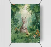 Una commovente stampa ad acquerello di una madre canguro che coccola il suo piccolo in una lussureggiante giungla tropicale. Perfetta per le camerette, le stanze dei bambini o per chiunque ami la fauna selvatica e le vibrazioni della foresta.