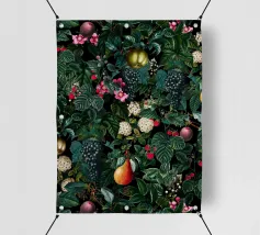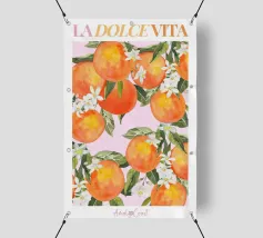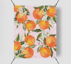 Un collage colorato di frutta fresca e fiori di ciliegio in tenui colori pastello che dà vita all'estate su uno sfondo rosa. Ideale per gli amanti del mercato della frutta e della natura!