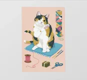 Un adorabile gatto calico siede con orgoglio accanto al suo lavoro, un piccolo tappetino intrecciato circondato da oggetti di artigianato come filo e forbici, creando una scena affascinante e stravagante.