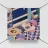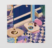 Una scena serena di un appuntamento per un caffè su un balcone illuminato dal sole, con un pavimento a scacchi viola e una vista sul mare. L'illustrazione cattura un momento di connessione pacifica e di svago elegante.