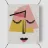 Un volto astratto minimalista con occhi chiusi, composto da semplici forme geometriche. La tavolozza di colori rosa, giallo, nero e beige crea un'espressione serena e assonnata, che incarna la tranquillità.