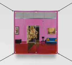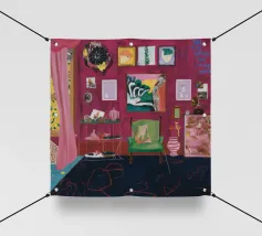 L'ambiente interno è caratterizzato da pareti rosa caldo, un mobile in legno che espone oggetti decorativi, una parete di galleria eclettica e una vista su una stanza adiacente.