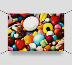 Un vivace mix di caramelle è distribuito su una superficie rosa, che mostra varie forme e colori, tra cui lecca-lecca roteanti e dolciumi rotondi. Questa disposizione giocosa invita a una gioiosa indulgenza.