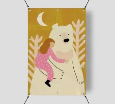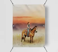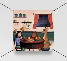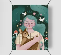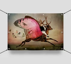 Un cavaliere intraprende un viaggio in cima a un maestoso cervo attraverso un paesaggio innevato. Le montagne lontane scintillano sotto un fresco cielo crepuscolare, evocando avventura e tranquillità.