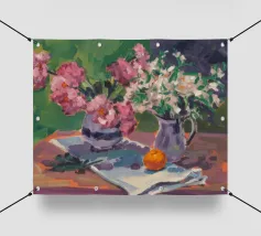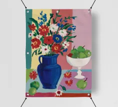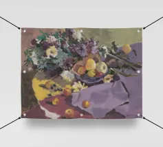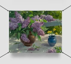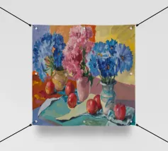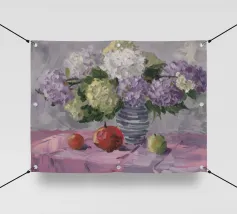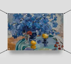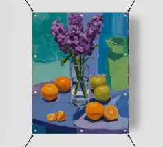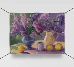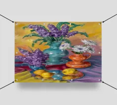 Una vivace composizione di natura morta con profumati lillà viola in un vaso blu intenso, accanto a un vaso blu più piccolo, mele verdi e limoni gialli, il tutto su un allegro sfondo giallo.