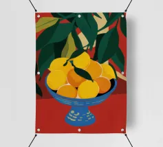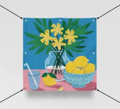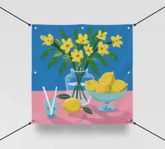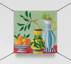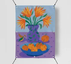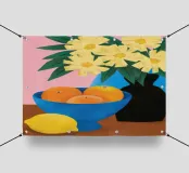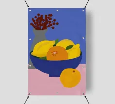 Un'elegante e semplice natura morta con un bouquet di fiori gialli in un vaso scuro accanto a una ciotola blu profondo piena di arance fresche. La composizione è serena e senza tempo, con un bel contrasto di colori.