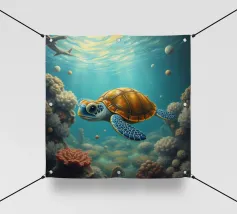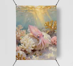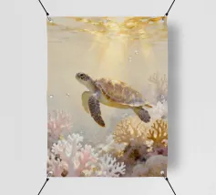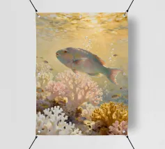 Una foca maculata scivola pacificamente tra le dolci onde, circondata da coralli che brillano nelle calde tonalità dell'oro e del blush. Quest'opera d'arte rivela il lato tenero dell'oceano: calmo, radioso e pieno di bellezze estetiche sotto la superficie baciata dalla luce del sole. Immaginato da Trinkets NL Design Studio, visualizzato con l'aiuto dell'AI.