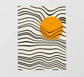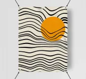 Una composizione minimalista in cui le linee nere che scorrono evocano le onde dell'oceano sotto un radioso sole giallo caldo. Il pezzo combina il movimento naturale con l'ordine di ispirazione Bauhaus, creando un'armonia visiva elegante e senza tempo.