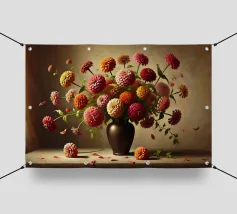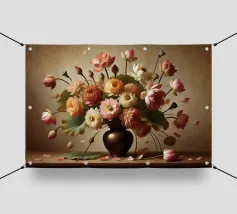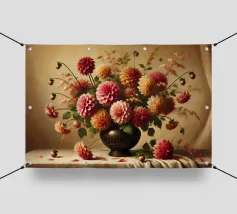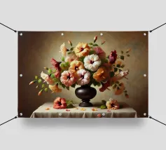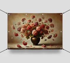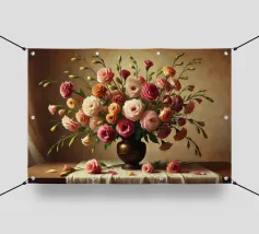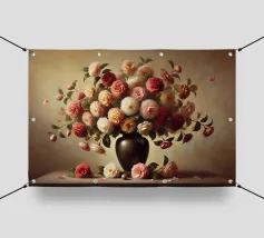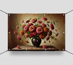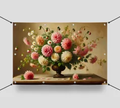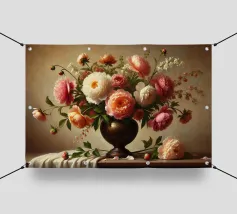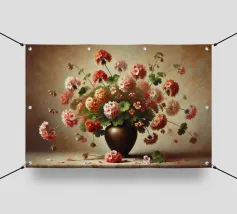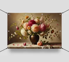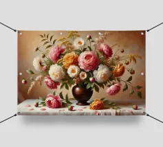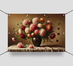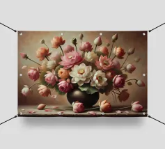 Uno splendido bouquet di fiori vivaci nei toni del rosa, del bianco e del rosso è esposto in un tradizionale vaso nero. I fiori, rigogliosi e pieni, creano un centrotavola di grande effetto.