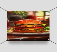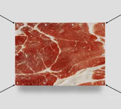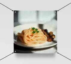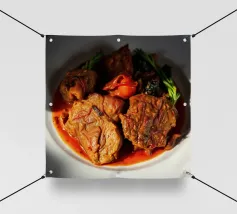 Una bella bistecca alla griglia è adagiata su un piatto bianco, ornato dai segni della griglia. La calda luce del sole mette in risalto i suoi colori ricchi, creando un'atmosfera invitante perfetta per il pranzo.